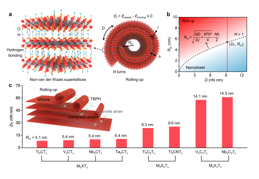 针对上述挑战,杨树斌教授团队创新性地提出了一种“刚度介导”合成策略,通过精准调控二维碳化物/碳氮化物原子层的弯曲刚度使其在快速形变过程中有序卷曲,构建出一系列由层间氢键耦合的非范德华超晶格材料(图1)。与传统依赖弱范德华作用的超晶格不同,这类氢键型非范德华超晶格展现出强层间电子耦合作用,载流子浓度高达1022 cm-3,电导率是传统二维MXene的22倍,达到30000 S cm-1。同时,该类非范德华超晶格薄膜实现了124 dB的屏蔽效能,优于目前所有已知的同厚度电磁屏蔽材料,刷新了同厚度人工材料的世界纪录。该项研究突破了传统二维范德华超晶格的局限,发展出构筑新型非范德华超晶格材料、探索新物性与新功能的新方向。