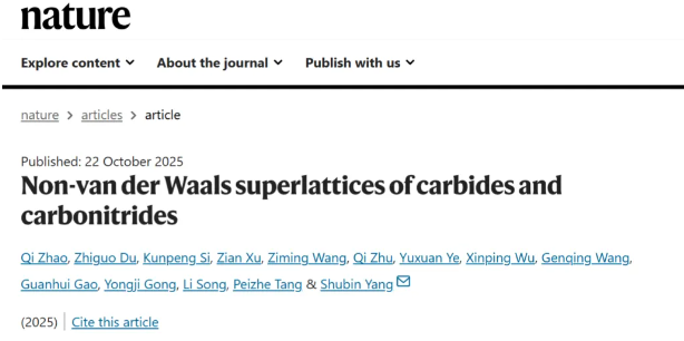 北航新闻网10月23日电(航宣)近日,北京航空航天大学材料科学与工程学院杨树斌教授联合宫勇吉教授、汤沛哲教授和中国科学技术大学宋礼教授等,报道新型非范德华超晶格材料突破了传统超晶格均基于范德华二维材料的限制,刷新了同厚度人工材料的世界纪录。相关成果于2025年10月22日以全文Article的形式发表于《Nature》杂志,题目为“Non-van der Waals superlattices of carbides and carbonitrides”。 北京航空航天大学材料科学与工程学院赵麒博士为第一作者,北京航空航天大学材料科学与工程学院杨树斌教授为通讯作者,北京航空航天大学材料科学与工程学院为第一单位。