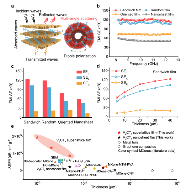 图4. 非范德华超晶格薄膜的超高电磁屏蔽性能