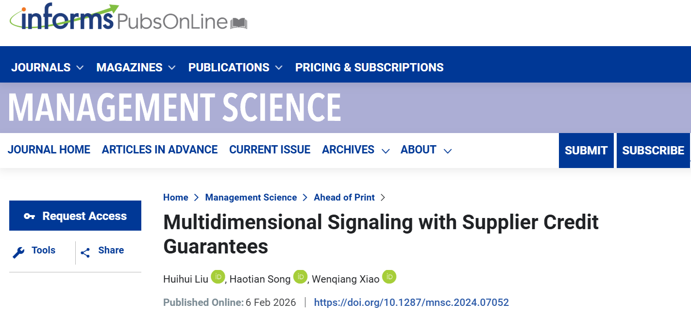 北航新闻网2月26日电(通讯员 陈潇潇)近日,北航经济管理学院刘慧慧老师在国际管理学著名期刊Management Science发表题为Multidimensional Signaling with Supplier Credit Guarantee(供应商信用担保下的多维信号传递)的研究论文。论文由北京航空航天大学刘慧慧老师、浙江大学宋昊天老师、纽约大学肖文强老师合作撰写。论文研究了在包含供应商、资金受限的买方和银行的供应链结构中信用担保的作用。